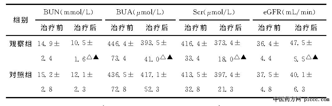 表2 两组慢性肾功能不全患者治疗前后肾功能指标水平比较 ()