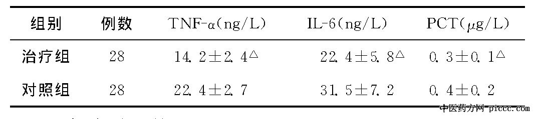 3.1 观察指标观察两组患者临床疗效及治疗后TNF-α、IL-6、PCT等血清炎性因子水平。