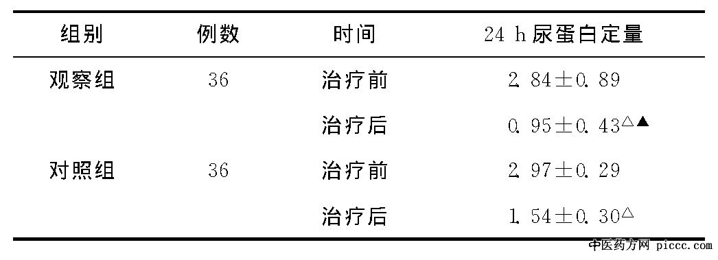 (1)24h尿蛋白定量。采用双缩脲法测定。(2)临床疗效。显效:治疗后临床症状消失或基本消失,24h尿蛋白定量降低≥30%;有效:治疗后临床症状均有改善,24h尿蛋白定量降低≥10%且<30%;无效:治疗后临床症状和检查结果无显著变化或加重[4]。