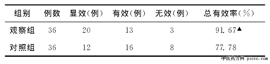 (1)临床疗效比较观察组总有效率为91.67%(33/36),高于对照组的77.78%(28/36),差异具有统计学意义(P<0.05)。见表1。