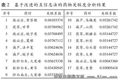 2.3.1 基于改进的互信息法的药物关联度分析 依据方 剂数量, 设置相关度(药物与药物之间的关联度)为 8, 惩 罚度(减少负面数据信息干扰的参数)为 2, 进行聚类分 析, 得到方剂中两两药物间的关联度, 其中关联系数在 0.03 以上的药对有 17 个。见表 2。