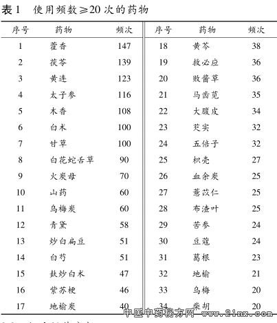 [3 ] , 对处方中的中药名称进行规范、 统一, 如“广藿香” 统一为 “藿香 ” , “关黄柏炭” 统一为“黄柏炭” , “粉葛” 统 一为 “葛根” 。但对于炮制方法不同的同一种药物, 仍保 留包含炮制法的药物名称, 如“白术” 和“麸炒白术” , “甘 草” 和 “炙甘草” , “乌梅” 和“乌梅炭” , “地榆” 和“地榆 炭” 等。