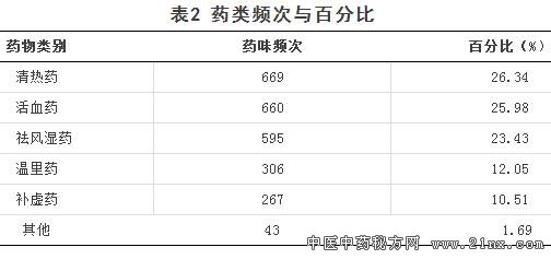 方剂中涉及到的药物分类有清热药13种,活血药7种,祛风湿药8种,补虚类7种,温里药8种,其他6种。将上述各类别药物使用频次及所占百分比进行统计,如表2。