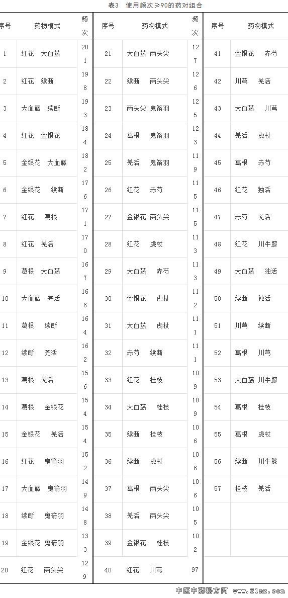 2.2 基于关联规则的组方规律分析 在“组方规律”中设置“支持度个数”为90,“置信度”为0.95,对药物组合频数及关联进行分析,并分别统计后列表(见表3,4),其中共包含14种药物,主要有红花、金银花、大血藤、续断、葛根、虎杖、鬼箭羽。数据呈现明显集中趋势,可见组方核心较为稳定。