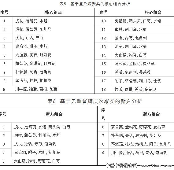 2.3熵聚类组方分析 将相关度与惩罚度分别设为8,4,通过以上条件约束,对数据进行基于复杂熵聚类的药物核心组合提取,共18个(表5),在此基础上应用无监督熵层次聚类运算,可分析得出新处方9个(表6)。