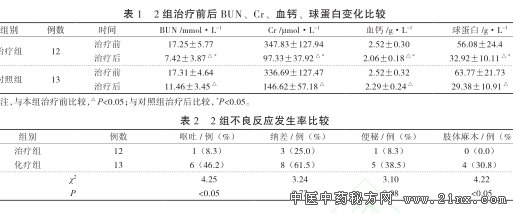 多发性骨髓瘤 (multiple?myeloma, MM) 是一种浆 细胞恶性克隆型疾病, 多见于老年人, 随着我国人口 老龄化日渐明显及临床检测手段的进步, 近年来发病 率呈现上升趋势。MM 临床上常伴肾脏损害, 甚至以 肾损害为主要、 首发表现而收入肾内科 [1.2] 。多发性骨 髓瘤合并肾病时存在一定治疗禁忌, 传统方案治疗并 发症多, 疗效难以令人满意。本研究通过对在我院就 诊的一组多发性骨髓瘤伴肾损害的患者进行中医辨 证施治与常规化疗方案联合治疗, 并与单纯采用化疗 的患者进行对比, 评价 2 组的疗效及不良反应, 以探 索多发性骨髓瘤肾病的中西医结合治疗方案。 资料与方法 1 一般资料 所有的研究病例均为 2007 年 7 月—2016 年 7 月 在连云港市第一人民医院就诊的多发性骨髓瘤伴肾 损害的患者, 均符合诊断标准 [3] 。根据治疗方案不同 分为常规化疗组 (对照组)和中医辨证治疗组 (治疗 组) 。其中, 治疗组 12 例, 男 6 例, 女 6 例; 平均年龄 67 岁。 对照组 13 例, 男 10 例, 女 3 例; 平均年龄 63 岁。 2 治疗方法: 治疗组采用中医辨证论治联合常规化疗, 对照组 采取常规方案化疗。 2.1 中医辨证 中医辨证论治参照 《中药新药临床 研究指导原则》 相关标准拟定 [4] 。 2.1.1 实证 痰毒瘀阻型, 治以清热化痰, 解毒活血。 方以清瘟败毒饮合涤痰汤加减。 2.1.2 虚证 ①脾肾阳虚, 治法: 温补脾肾, 通络消 肿。主方: 补中益气汤合右归丸加减。②肝肾阴虚, 治法: 滋补肝肾, 养阴生精。主方: 知柏地黄汤加减; ③气血两虚: 治则: 益气养血。方药: 十全大补汤加减。 2.1.3 虚实夹杂 肾虚血瘀型治疗以补肾化瘀。予 地黄饮子合活血效灵丹加减。 2.2 常规化疗方案 MPt 方案 (马法兰 6mg, 1 ~ 4d; ? 强的松 1mg/kg, 1 ~ 14d; 沙利度胺 200mg/d, 长期服 用) 或?VADt 方案 (长春新碱 0.4mg, 1 ~ 4d; 多柔比星 10 ~ 20mg, 1 ~ 4d; 地塞米松 40mg, 1 ~ 4d, 9 ~ 12d, 7 ~ 20d; 沙利度胺 200mg/d, 长期服用。有神经病变 者长春新碱减量) 2.3 支持治疗 患者常规应用复方硼酸漱口水、 制霉 菌素溶液交替漱口。化疗间歇期体温超过 38.5℃者, 送病原学培养, 查找感染灶, 给予有效抗生素治疗, 必要时加抗真菌药。粒细胞缺乏期转层流病房, 应用 G-CSF, 血小板下降至 20×10 9 /L 以下或有严重出血 时输注血小板, 防止重要脏器出血。符合透析指征的 患者先行血液透析。有骨质破坏的病人使用磷酸盐 治疗。 3 疗效观察 2组均进行2疗程的治疗, 治疗前后 (住院或门诊) 监测血肌酐 (Cr) 、 尿素氮 (BUN) 及血钙、 球蛋白变化, 以判断多发性骨髓瘤肾病的治疗效果。根据患者临 床症状, 观察患者有无明显的恶心呕吐、 纳差、 便秘、 肢体麻木等不良反应。 4 统计学方法 应用 SPSS?13.0 软件, 统计分析方法采用配对 t 检 验、 成组 t 检验、 卡方检验。 结 果 1 2 组临床疗效比较 见表 1。通过对比发现, 2 组患者治疗后 Cr、 BUN 及血钙、 球蛋白均较治疗前好转, 差别有统计学意义。 中西医结合治疗组治疗后的肾功能及血钙对比化疗 组治疗后结果也有统计学差异, 可以认为中西医结合 治疗组疗效好于单纯化疗组。2 组治疗后的球蛋白未 发现显著差异, 原因分析见讨论部分。数据见表 1.2。 2 不良反应 见表 2。治疗组呕吐、 纳差、 便秘、 肢体麻木等不 良反应发生率低于对照组, 且呕吐与肢体麻木与对照 组比较, 有统计学差异 (P<0.05) 。 ![]() 讨 论 多发性骨髓瘤好发于中老年患者, 本研究 2 组患 者的平均年龄分别为 63 岁和 67 岁。老年人本身肾 功能储备下降, 且多发性骨髓瘤本身因产生大量的 M 蛋白尤其是轻链易沉积于肾小管基质膜、 间质及肾小 球基质膜、 系膜, 破坏肾小球肾小管功能, 造成骨髓瘤 肾病发病 [5.6] 。多发性骨髓瘤肾病是老年患者中最常 见的继发性肾功能损害的病因, 但随着原发病的控制 这种肾功能损害大多数是可逆行的, 仅有约 1%?的患 者最终不能脱离肾脏替代治疗 [7] 。随着医药科技的发 展, 国际上治疗多发性骨髓瘤的新药和治疗方案不断 涌现。但是, 一方面国外新药获准进入我国临床尚需 时日, 且进口药价格昂贵限制了国内的临床应用; 另 一方面大量资料显示多发性骨髓瘤合并肾病时存在 一定治疗禁忌, 采用传统化疗方案治疗并发症多, 疗 效难以令人满意。因此, 寻找低毒、 高效、 廉价的方案 治疗多发性骨髓瘤肾病显得尤为重要。近年来国内 学者一直在探索采取中国传统医学疗法与常规化疗 结合的治疗方案, 以减轻化疗副作用、 改善多发性骨 髓瘤肾病患者的预后, 并取得一定进展 [8.9] 。 多发性骨髓瘤在传统祖国医学中属于骨痹、 骨 蚀、 虚劳、 血虚等范畴。病变在髓, 累及血液、 骨, 在脏 属肾。骨髓瘤主要临床表现为骨痛、 贫血以及异常球 蛋白增多症表现包括骨髓瘤肾病、 高粘滞血症等。而 祖国医学中认为 [10] , “肾主骨, 生髓” 故认为骨痛与肾 相关, 肾虚不荣则通; “肾藏精, 精血同源” , 故肾虚可 导致血虚; “久病必瘀” , 且瘀血不去, 新血不生, 血虚 更重。瘀阻血脉, 则易发生高粘滞血症; 肾虚不足, 毒 蕴于肾, 临床表现为骨髓瘤肾病。故骨髓瘤肾病中医 病机为虚实夹杂, 以肾虚为本、 血瘀为标 [11] 。 我们对我院就诊的部分多发性骨髓瘤肾病患者 采用中医辨证为实证、 虚证、 虚实夹杂三型, 分别按证 施治。通过对中西医结合治疗组与化疗组患者的比 较, 我们发现, 中