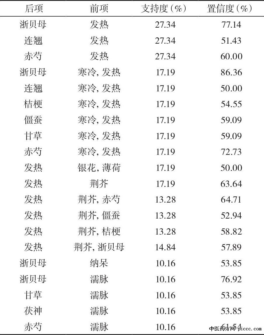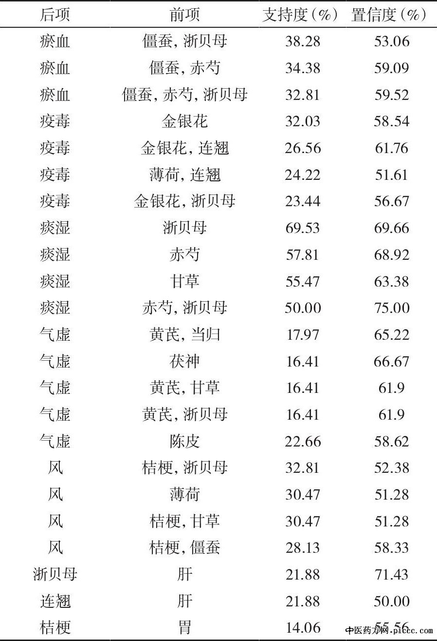 3.据症选药外科医案中症状与药物之间的关联规则结果, 部分地反映出丁甘仁对某些症状的特殊用药心得。如表3所示, 只出现发热症状时, 用药多集中在荆芥、金银花、薄荷、浙贝母、赤芍、桔梗、僵蚕等, 体现丁甘仁清热、透热的用药思想;若出现“寒热并见”时, 说明表证亦在, 但并不排除里证, 所以赤芍、甘草、僵蚕、桔梗、连翘、浙贝母等清里热药依然是常用药物。此外, 濡脉多对应茯神、赤芍、甘草、浙贝母等;纳呆多选用浙贝母。对于浙贝母在濡脉、纳呆症状中具有较高的关联性, 则说明丁甘仁对浙贝母的认识不局限于清热化痰, 也提示其在脾虚或湿盛的病机中所发挥的作用。