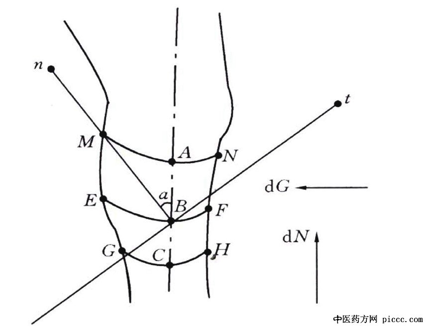 注:此图引自文献[7]。ABC、MEG、NFH代表各条小夹板;MAN、EBF、GCH代表每根绑定线;t为骨折面,n为骨折面法线,α为骨折面与骨断端横截面夹角,d G为绑定压力,dN为骨折端轴向力。