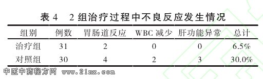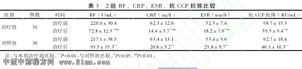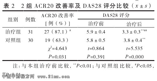 安徽省六安市中医院康复一科:唐燕 安徽省六安市中医院肾病一科:高磊 摘要 目的:观察桂枝汤加术附加减治疗类风湿关节炎临床疗效。方法:将 61 例类风湿关节炎患者随机分为治疗组 31 例和对照组 30 例,对照组给予甲氨蝶呤 7.5mgBiw,白芍总苷0.6gTid,美洛昔康7.5mgBid;治疗组在对照组基础 上联合桂枝汤加术附加减中药口服,2 组疗程均为 12 周。观察 2 组中医证候疗效、ACR20 改善率、DAS28 评分、实 验室指标(血、尿、粪常规、肝肾功能、RF、CRP、ESR、抗 CCP 抗体)及不良反应发生情况。结果:治疗组中医证候疗 效优于对照组(P<0.05)。2 组治疗后 RF、CRP、ESR、抗 CCP 抗体及 DAS28 评分与本组治疗前比较均降低(P<0.01)。 治疗组治疗后 RF、CRP、ESR、抗 CCP 抗体及 DAS28 评分均低于对照组,ACR20 改善率高于对照组,差异均有统计 学意义(P<0.05 或 P<0.01)。治疗组药物不良反应发生率明显低于对照组(P<0.05)。结论:基于太阳少阴病方剂桂 枝汤加术附加减可有效改善类风湿关节炎症状、降低疾病活动相关指标,且能减少常规抗风湿药物不良反应的发生。 关键词 类风湿关节炎;桂枝汤;太阳少阴病 类风湿关节炎(rheumatoidarthritis,RA)是一种 慢性自身免疫性疾病,临床以对称性多发性关节炎为 主要表现,由于滑膜血管翳形成,造成关节功能障碍, 可致永久性残疾,影响生活质量,严重危害人类健康。 RA 病因病机尚未明确,西医目前尚无特效疗法。RA 属“痹证”范畴,与历代医家所述湿痹、尪痹、历节等 相似。张仲景在《伤寒论》和《金贵要略》中对各种关 节疼痛性疾病均有描述,并指出痹证当属于表证,并 根据表里阴阳辨证分为表阴证和表阳证。根据六经 辨证,痹证多属于少阴病(表阴证)或太阳病(表阳证)。 笔者以太阳少阴病为理论依据,以桂枝汤加术附为基 础方加减治疗 RA,在临床上取得比较满意的疗效,现 报道如下。 资料与方法 1 一般资料 将61例符合RA诊断标准于2015年01月~2016 年 02 月在我院门诊或住院的患者,采用随机数字表 法分为治疗组和对照组。治疗组 31 例,男 11 例,女 20 例;年龄 23 ~ 65 岁,平均(41.2±10.1)岁;病程 2 ~ 6 年,平均(3.7±0.8)年。对照组 30 例,男 11 例, 女 19 例;年龄 30 ~ 71 岁,平均(42.4±9.5)岁;病程 2 ~ 7 年,平均(3.9±1.3)年。2 组患者在性别、年龄、 病程等方面差异无统计学意义(P>0.05)。 2 诊断标准 西医诊断标准符合美国风湿病学会(ACR)和欧 洲抗风湿病联盟(EULAR)提出的分类标准 [1] ;太阳 少阴病标准参照《伤寒论》六经辨治诊断依据(太阳 病、少阴病):主症:关节肿胀、疼痛,晨僵,肌肉麻木; 次症:倦怠乏力,精神萎靡,小便不利,大便时溏时干, 或身体重着、遇寒加重,恶风;舌脉:舌质淡或淡红,脉 浮虚或脉沉细。 3 排除标准 合并其他风湿病如系统性红斑狼疮等;合并心脑 血管、肝、肺、肾等重要器官严重疾病;恶性肿瘤;妊娠 或哺乳期妇女;急慢性感染性疾病;精神性疾病;有过 敏体质或不能耐受中药。 4 治疗方法 2 组均给予常规抗类风湿治疗:甲氨蝶呤 7.5mg Biw,白芍总苷0.6gTid,美洛昔康7.5mgBid。治疗 组同时加服中药,其基本方:桂枝汤加术附。药物组 成:桂枝 12g,芍药 12g,炙甘草 6g,生姜 9g,大枣 6 枚, 苍术 12g,制附片 9g。1 剂 /d,水煎 2 次,取汁混合分 3 次口服;常用加减:表阳证明显,加葛根、麻黄;里热 重,加生石膏;湿热重,加生薏苡仁、连翘;小便不利、 浮肿,加茯苓;瘀血重,加桃仁、红花;表虚,加用黄芪、 党参;心悸,加茯神、远志;偏身痛,加大黄、细辛等。2 组疗程均为 12 周。 5 观察指标及方法 5.1 疗效性观察 2 组中医症状评分依据《中药新药 临床研究指导原则(试行)》 [2] 中 RA 症状分级量化表, 评价指标有关节疼痛,关节肿胀,屈伸不利,畏寒恶 风,晨僵等;均按症状分级计分:无,0 分;轻度 2 分;中 度,4 分;重度,6 分。 ACR20 改善率采用美国风湿病协会(ACR)定义 的标准 [3] :患者压痛及肿胀关节数(28个)有 20% 的 改善以及下列 5项中至少 3项有 20%的改善:①患 者对疼痛程度的评估 ;②日常生活能力 ;③医生评价 ; ④病人评价 ;⑤急性期反应物(ESR或 CRP)。28 个 关节数疾病活动度评分(DAS28)采用欧洲抗风湿病 联盟(EULAR)标准 [4] 。计算公式参照DAS-SCORE: DAS28-ESR=0.56× 压痛关节数 +0.28× 肿胀关节数 +0.70×ln(ESR)+0.014× 患者健康评分。 5.2 实验室指标观察 血、尿、粪常规、肝肾功能及 RF、CRP、ESR、抗 CCP 抗体。 5.3 中医证候疗效判定 参照郑筱萸《中药新药临床 研究指导原则(试行)》 [2] ,临床痊愈:中医症状、体征消 失或基本消失,证候积分减少≥ 95%;显效:证候积分 减少 70% ~ 95%;有效:证候积分减少 30% ~ 70%; 无效:证候积分减少不足 30%。 6 不良反应 治疗前后各监测 1 次患者血、尿、粪常规及肝肾 功能,并记录不良反应发生情况。 7 统计学分析 采用 SPSS17.0 软件进行分析。计量资料以均数 ± 标准差(x _ ±s)表示,采用 t 检验和方差分析;计数 资料采用卡方检验或秩和检验。 结 果 1 中医证候疗效比较 经秩和检验,治疗组疗效优于对照组,差异具有 统计学意义(χ 2 =3.906,P=0.048)。见表 1。 ![]() 2 ACR20 改善率及 DAS28 评分比较 2 组治疗后与本组治疗前比较,DAS28 评分均 降低,差异均具有显著性(P<0.01)。治疗组治疗后 ACR20 改善率及 DAS28 评分与对照组比较均具有显 著性差异(P<0.05 或 P<0.01)。见表 2。 ![]() 3 2 组患者 RF、CRP、ESR、抗 CCP 抗体比较 2 组患者治疗后与本组治疗前比较,RF、CRP、 ESR、抗 CCP 抗体均降低(P