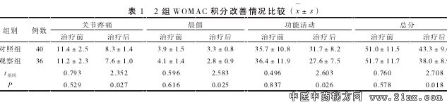 广东省湛江中心人民医院 钟邱,林凯,苏小霖,吴养 摘要 目的:探讨四妙散加味联合针灸推拿治疗膝关节骨性关节炎临床疗效。方法:将 76 例确诊为膝关节骨性关节 炎且中医证型属于湿热痹阻的患者纳入研究并随机分组,对照组 40 例予塞来昔布治疗,观察组 36 例则采用四妙散 加味联合针灸推拿治疗,1 个月为 1 个疗程。比较 2 组患者临床综合疗效及关节疼痛、晨僵及功能活动(WOMAC 积 分)改善情况;观察不良反应情况。结果:2 组患者症状均缓解,但各指标改善方面观察组均更显著,差异具统计学意 义;对照组 3 例出现胃肠不适,观察组则无不良反应。结论:四妙散加味联合针灸推拿治疗膝关节骨性关节炎疗效显 著,较塞来昔布而言,患者临床症状、关节症状及功能的改善情况均更显著,值得推广。 关键词 四妙散加味;针灸推拿;膝关节骨性关节炎;临床观察 膝关节骨性关节炎(KOA)又称为退行性关节 病,是临床常见的骨关节疾病,以关节疼痛、肿胀为主 要临床表现。本病多见于中老年女性,我国发病率为 50% ~ 80%,随年龄升高,发病率成逐渐升高趋势,严 重影响患者生活质量 [1] 。KOA 治疗药物较多,对乙酰 氨基酚、COX-2 抑制剂、糖皮质激素等抗炎镇痛药物 的应用可改善大多患者的临床症状,但部分患者常因 难以耐受各类副作用而影响治疗。如何提高本病的 临床疗效并且不增加不良反应已成为研究的热点及 难点,我们应用四妙散加味联合针灸推拿治疗 KOA, 疗效显著,现报道如下。 资料与方法 1 诊断标准 参照《中医病症诊断疗效标准》 [2] 。 2 纳入标准 ①符合诊断标准,并且已知情同意者;②中医证 型属湿热痹阻;③受试者自身无严重疾病;④年龄 38 ~ 70 岁;⑤所有患者均经我院医学伦理会审核通 过。 3 排除标准 ①女性患者尚处在哺乳期或妊娠期,不便纳入者; ②中医证型不符;③肝肾功能严重损伤;④精神病不 能配合治疗;⑤受试药物过敏;⑥存在类风湿性关节 炎等其他能引起关节疼痛的疾病者。 4 一般资料 病例均为我院 2014 年 7 月—2015 年 6 月确诊为 KOA 且中医证型属于湿热痹阻患者 76 例,采用随机 数据表法进行分组,观察组 36 例,男 15 例,女 21 例; 年龄(42.74±8.39)岁;病程(22.14±8.37)月;X 线诊 断分期(参照《骨关节炎诊治指南》):I 期 3 例,Ⅱ期 12 例,Ⅲ期 19 例,Ⅳ期 2 例。对照组 40 例,男 16 例, 女 24 例;年龄(41.86±8.07)岁;病程(21.36±8.48) 月;X 线诊断分期:I 期 4 例,Ⅱ期 14 例,Ⅲ期 19 例, Ⅳ期 3 例。2 组年龄、性别、病程、分期等资料均无统 计学差异,具可比性。 5 治疗方法 5.1 对 照 组 塞 来 昔 布(辉 瑞 制 药,批 准 文 号 J20030098),200mg/ 次,2 次 /d。 5.2 观察组 采用针灸推拿联合四妙散加味治疗。 5.2.1 针刺治疗 均用 0.25mm×40mm 华佗牌一次 性针灸针进行操作,进针前嘱患者平卧,安抚并消除 其紧张及顾虑,以免发生晕针。针灸时选取阳陵泉、阴 陵泉、内犊鼻、外犊鼻、梁丘、血海、足三里、太溪等穴 位。垂直进针,施予平补平泻法,得气后留针 30min。 5.2.2 推拿治疗 嘱患者仰卧,通过揉法和滚法使膝 关节周围肌肉放松;点按足三里、内犊鼻、阳陵泉、外 犊鼻、委中;以拇指患者对患者髌骨上下缘进行轻揉 3 ~ 5 次;以五指对患者髌骨向上提捏,次数以 3 ~ 5 次为宜;握住踝部,依据患者关节活动度顺时针和逆 时针交替运动 3 ~ 5 次;最后再以揉法和滚法使关节 周围肌肉方式。推拿时间 0.5h 为宜,2 次 / 周。 5.2.3 中药汤剂 方选用自拟四妙散加味,由川牛 膝、苡米、防己、连翘、木瓜各 10g,苦参、秦艽、苍术、生 地、赤芍各 10g,黄柏 5g,忍冬藤15g,并随症加减,药 物均由我院中药房统一代煎,150mL/ 次,2 次 /d,所有 治疗手段均以 1 个月为疗程。 6 观察指标 观察 2 组患者关节疼痛、晨僵及功能活动的改善 情况。采用 WOMAC [5] 指数评分方法,将患者关节疼 痛、晨僵及功能活动的程度从无、轻、中、严重到非常 严重分别以 0 ~ 4 分表示。其中关于疼痛的项目共 5 项,总分 20 分;关于僵硬 2 项,总分 8 分;关于关节功 能活动 17 项,总分 68 分。观察 2 组临床综合疗效及 不良反应差异。 7 统计学方法 采用 SPSS13.0 软件,均采用双侧检验,统计前对 数据进行正态分布检测,计量资料用(x _ ±s)表示,比 较用 t 检验,率用卡方检验;P<0.05:差异有统计学意 义。 疗效观察 1 疗效指标 参考《中医病证诊断疗效标准》疗效标准,治愈: 无关节疼痛及肿胀,活动功能正常;好转:关节疼痛、 肿胀减轻,活动功能好转;未愈:关节疼痛及肿胀无变 化。 2 结果 2.1 WOMAC 积分比较 经治疗后,2 组患者症状均 比治疗前缓解(P<0.05);各指标改善方面观察组均更 显著(P<0.05),见表 1。 ![]() 2.2 综合疗效比较 对照组 3 例出现胃肠不适,观察 组则无,组间比较不良反应发生率相仿;2 组治愈及好 转例数组间单独比较无显著差异,P>0.05;观察组有 效率更高,差异显著,P<0.05,见表 2。 ![]() 讨 论 KOA 是一种由于人体机能衰退而导致的退行性 疾病,中老年人多见,严重影响患者的生活质量。本 病病变部位并非局限于软骨,而是牵涉至整个关节。 KOA 的病因还未被完全阐明,多数学者认为长期超 负荷负重及关节退化是重要的的发病基础。治疗上 本病尚缺乏特效药物,发病初期可采用非药物治疗, 通过减轻体重、适当的有氧运动等缓解疼痛,如仍未 缓解或反而加重,则需考虑药物治疗 [3] 。非甾体消炎 药有一定疗效,但由于药物副作用较大,应谨慎使用。 我