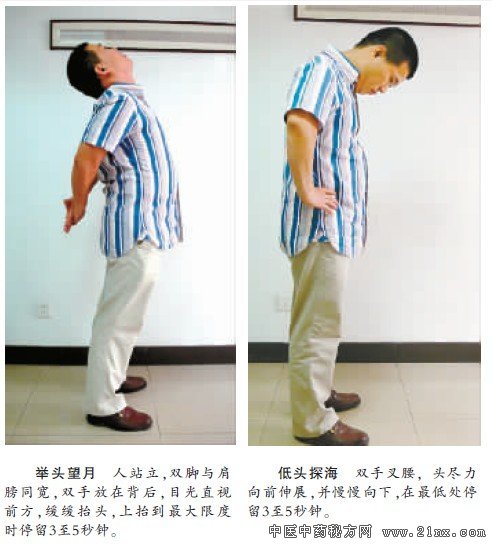 举头望月:人站立,双脚与肩膀同宽,双手放在背后,目光直视前方,缓缓抬头,上抬到最大限度时停留3~5秒钟.