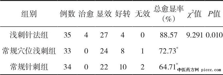 2.治疗后总体疗效评价各组总体疗效经秩和检验, 差异有统计学意义 (P<0.05) ;进一步两两比较, 浅刺针法组的总体疗效与其余两组相比, 差异均有统计学意义 (P<0.05, P<0.05) , 提示浅刺针法优于其余两种疗法;而常规穴位浅刺组与常规针刺组比较, 差异无统计学意义, 提示两种疗法总体疗效相当, 详见表4。