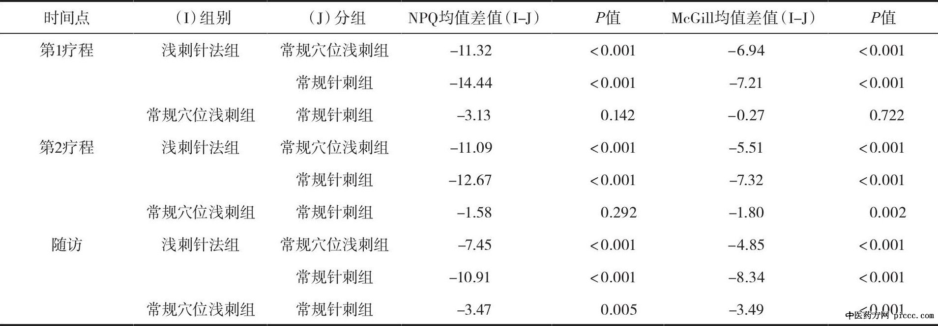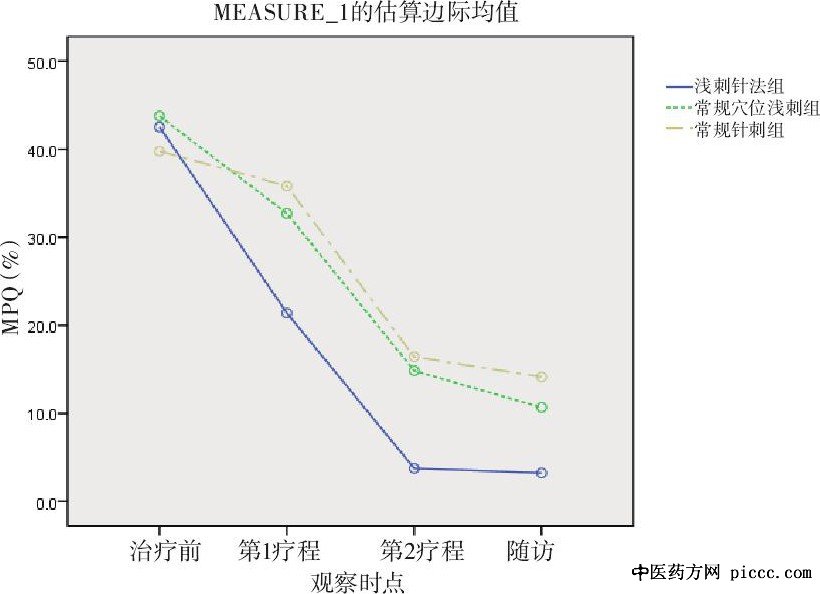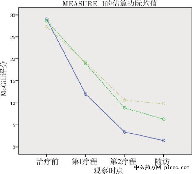 经重复测量方差分析, 因不满足协方差矩阵和球型检验条件, 故采用G-G模型, NPQ评分组内比较 (F=986.441, P<0.001) , Mc Gill评分组内比较 (F=1940.23, P<0.001) , 提示多次测量比较差异有统计学意义 (P<0.05) ;进一步再进行组间两两比较:由图1-图2可见, 3组经治疗后各项评分均有下降, 但浅刺针法组下降幅度较其余两组大, 提示浅刺针法组较其余两组起效快, 疗效更显著。