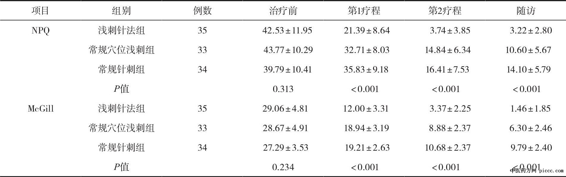 3.1观察指标 (1) 评价量表:Northwick Park (NPQ) 颈痛量表和Mc Gill疼痛量表; (2) 评价时点:治疗前、第1疗程、第2疗程及随访, 共评价4次。