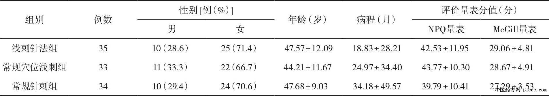 6.脱落标准 (1) 研究过程中因各种原因无故退出者; (2) 随访因个人原因无故失访者。符合上述任何1项, 归为脱落病例, 其临床数据不纳入本研究的统计分析中。本研究脱落3例, 其中常规穴位浅刺组2例, 常规针刺组1例。