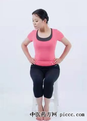 动作关键:坚持座位,双足分隔,与肩同宽,双手叉腰;头颈用力伸向左前方,双目凝视前方地上约1.5厘米处;身体不动,颈部继续努力向前探伸一起吸气,然后复原,一起呼气。同样的动作再做一次,这次头颈用力伸向右前方。左右各做10次。