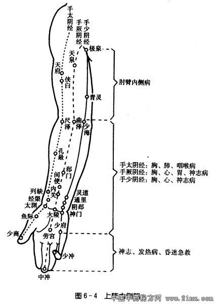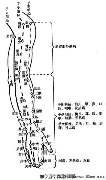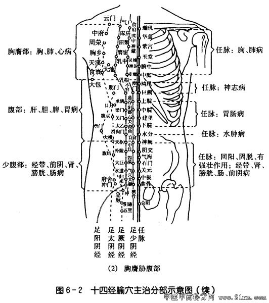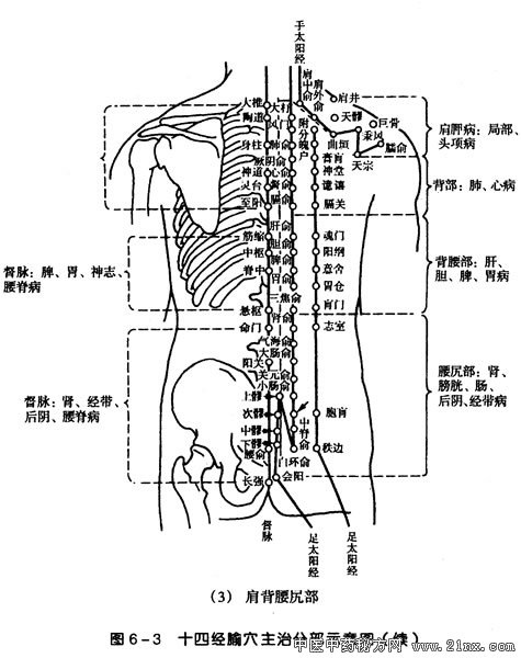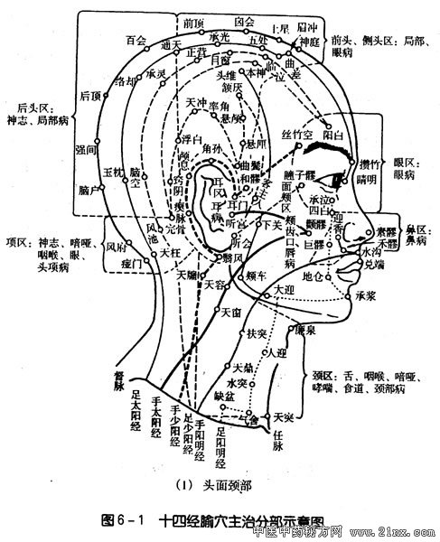 腧穴与经络脏腑的关系 《素问·气府论》说腧穴是“脉气所发”。《灵枢·九针十二原》解释说:“节之交,三百六十五会,……所言节者,神气之所游行出人也,非皮肉筋骨也”。《灵枢·小针解》解释说:“节之交,三百六十五会者,经络之渗灌节者也”。从上面的论述,足可说明经络与腧穴的密切关系。人体的经络“内属于脏腑,外络于肢节”。十二经脉的分布,阳经在四肢之表,属于六腑;阴经在四肢之里,属于五脏。并通过十五络的联系,沟通表里,组成了气血的通路,它们“内溉脏腑,外濡肤腠”,维持着正常的生理功能。就病理而言,经络与脏腑之间也是息息相关的。病起于外者,经络先起病,之后可传于脏腑;病生于内者,脏腑先病之后可反映于经络。例如:太阳伤寒,首先出现头项腰背部疼痛的经络证候,然后出现脏腑证候。又如阑尾炎、胆囊炎在腹痛、胁痛的同时,都可在其下合穴附近找到压痛点。这些病症的由来,就是因为某些致病因素导致经络脏腑的气血偏虚偏实的结果。针灸治病,就是根据经络与脏腑在生理病理上相互影响的机制,在腧穴部位进行针灸或其他治疗,取得“通其经脉,调其血气”的作用,从而排除病理因素,治愈疾病。所以《灵枢·刺节真邪》说:“用针者,必先察经络之实虚,……一经上实下虚而不通者,此必有横络盛加于大经,令之不通,视而泻之,此所谓解结也。”“解结”,就是疏通经络的意思。由此看来腧穴与经络脏腑无论在生理病理还是在治疗上都有着密不可分的关系。 人体穴位分布图 一、头颈部腧穴的分布