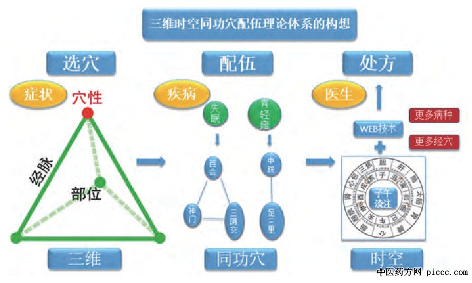 在三维选穴, 同功配伍的基础上, 再配合子午流注选穴方法, 形成三维时空同功穴配伍的理论框架 (见图1) 。子午流注按时取穴已有计算机系统, 根据天干、地支、时辰不同, 主穴与配穴一目了然, 按时开穴属配伍的一种方法, 但只是开穴的腧穴配伍, 并未与疾病联系起来, 也未与定经、定位、定性联系起来。目前项目组已经完成腧穴配伍优选方案评价系统, 未来的研究将以腧穴配伍优选方案评价体系为模板, 进一步扩大有效病种, 扩大经穴的穴性研究, 将其大数据与模拟专家决策能力的计算机技术 (WEB技术) 结合形成供临床医生使用的针灸处方软件程序, 以便广大临床医生诊治疾病时高速便捷使用该体系, 更加科学的提高临床疗效。