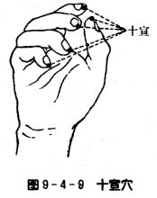 [出处]《备急千金要方》:“手十指端去爪甲一分。”《针灸大成》:“在手十指头上,去爪甲一分。” [别名]鬼城。 [位置]在手1峭尖端,距指甲游离缘0.1寸(指寸),左右共10穴。(图9—4—9) ![]() [简易取法]两手1峭尖,距指甲游离缘0.1寸(指寸),左右共10穴。 [解剖]布有指掌侧固有动、静脉形成的动、静脉网;布有指掌侧固有神经和丰富的痛觉感受器。 [功用]开窍醒脑,泄热镇痉。 [主治]昏迷,晕厥,中暑,热病,中风,咽喉肿痛,指端麻木,小儿暴痫,急惊风,狂症,手指掣痛。 [配穴举例]配人中、大椎、鸠尾,主治癫狂;配大椎、耳尖,主治高热。 [刺灸法]点刺出血,或浅刺0.1-0.2寸;可艾炷灸。 |