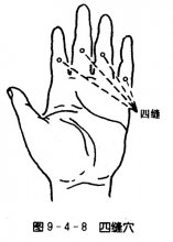 [出处]《奇效良方》:“四缝四穴,在手四指内中节。” [位置]在第2—5指掌侧,近端指关节的中央,一侧4穴。(图9—4—8) ![]() [简易取法]在手2、3、4、5指的掌面,当第2指关节横纹中点取穴。 [解剖]有指浅、深层肌腱,指腱鞘,指十字韧带,指关节腔;指掌侧固有动、静脉;指掌侧面固有神经。 [功用]健脾消积。 [主治]小儿疳积,小儿腹泻,蛔虫症,小儿纳食不化,百日咳。 [配穴举例]配内关、合谷,主治百日咳;配足三里,主治小儿消化不良;配中脘、章门、足三里、公孙、脾俞、胃俞,主治疳积。 [刺灸法]点刺0.1—0.2寸,挤出黄白色透明样粘液。 |