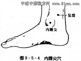 [出处]《备急千金要方》:“转筋在内股,灸内踝尖。” [位置]在足内侧面,内踝的凸起处。(图9-5-4) ![]() [简易取法]内踝之最高点处。 [解剖]皮肤,皮下组织,内踝。布有隐神经的小腿内侧皮支的分支,胫前动脉的内踝网、内踝前动脉的分支和胫后动脉的内踝支。 [功用]定痉止痛 [主治]霍乱转筋,小儿不语,乳蛾。 [刺灸法]禁刺,可灸。 |
