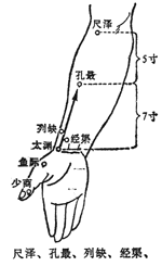 [出处]《灵枢·本输》:“入于尺泽。” [别名]鬼受,鬼堂,气堂。 [功用]清泄肺热,舒筋止痛,和胃理气。 [主治] 1.呼吸系统疾病:肺结核,咯血,肺炎,支气管炎,支气管哮喘,咽喉肿痛,胸膜炎; 2.运动系统疾病:肘关节病,脑血管病后遗症,前臂痉挛; 3.精神神经系统疾病:肩胛神经痛等,精神病,小儿抽搐; 4.其它:膀胱括约肌麻痹(小便失禁)。 [刺灸法] 刺法:1.直刺0.5~0.8寸,局部酸胀,针感向前臂或手部放散。 2.点刺出血,用于急性吐泻。 灸法:艾炷灸或温针灸5~7壮,艾条灸10~20分钟。 [配穴举例]配委中穴(放血),治疗急性胃肠炎;配曲池,治疗肘挛痛;配少商、合谷穴,治疗咽喉肿痛。 [附注]“合”穴。 [现代研究]临床研究观察针刺尺泽穴,有降血压的作用,对高血压病人有一定疗效。实验观察,针刺尺泽穴对结肠蠕动有调整作用,可使不蠕动或蠕动很弱的降结肠下部或直凸的蠕动增强。 |
