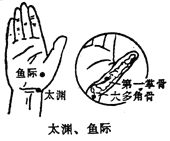 [别名]鬼心、大泉、太泉、天泉、大渊。 [穴名解]太,指大;渊,指深。本穴是本经的原穴,又是八会穴之脉会。指其脉气在此处大会,博大而深,故名太渊。 [位置]在腕掌侧横纹桡侧,桡动脉搏动处。