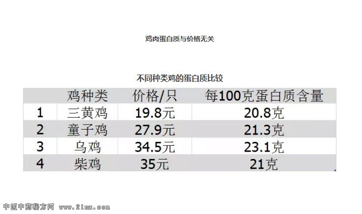 图:鸡肉的蛋白质与价格无关 鸡肉的健康隐患:鸡皮中的饱和脂肪酸有害血管、心脏健康;鸡脖子有淋巴结,需去除鸡皮,皮下及鸡脖肉的网状物。
