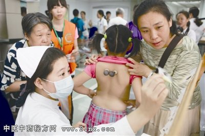 为确保今年冬病夏治的疗效,该院组织10名中医专家现场辨证指导,抽调50多专业技术人员现场开展治疗服务,设立有三伏贴、三伏灸、三伏熨、三伏补四个服务区域,为群众提供便捷、舒适的一条龙服务。18日这一天接诊冬病夏治人员达3600余人。 被评为“浙江省首家县(市)级中医药适宜技术优秀示范基地”的富阳市中医医院,开设“冬病夏治”门诊20余年来,其门诊量连年递增,2013年该院针灸科和中医儿科“冬病夏治”共达2094例,比上一年1200余例猛增74.1%。7月15日,该院今年“冬病夏治三伏贴”服务正式开张,当天预约就诊就创历史新高达500余例。 该院副院长王文文主任中医师介绍,这些成果得益于该院创建中医药“时令养生”推广平台:一是建立“冬病夏治”适宜技术专家团队,对推广应用“冬病夏治”全院上下一齐抓,把责任落实到人。二是针灸科和中医儿科根据成人和儿童不同的发病特点,分别推出“冬病夏治”目录,向群众广为宣传。三是通过开展知识讲座、义诊及咨询、印发宣传资料等形式,使中医药“夏令养生”知识进社区、进乡村、进学校、进家庭。四是要求门诊各科室发现适合冬病夏治的病例,直接推荐到针灸科“外治室”诊疗。五是与10家乡镇(街道)卫生院(社区卫生服务中心)建立“冬病夏治”紧密型合作,使社区、乡村居民在家门口也能享受到“冬病夏治”规范服务。 7月18日,广东省江门市各大医院传统中医三伏天灸开始的日子。三伏天灸可冬病夏治,笔者从五邑中医院了解到,今年市民一如既往的热衷三伏天灸,18日到该院预约贴药的市民达3000多人,比去年增加了2倍。 一大早,五邑中医院门诊大楼6楼人头攒动,在康复科和针灸科挤满了很多前来贴三伏贴的市民,其中尤以老人和孩子居多。医院在门诊大楼设置了多个贴药点,由于来贴药的市民较多,每个贴药点都排起了长队。 “这已经是我和老伴连续5年来贴三伏贴了,这个药贴对缓解慢性病的确效果好,这几年我的哮喘病有了明显好转。”市民林伟贤说。