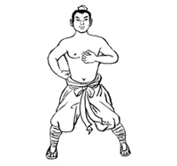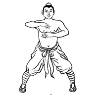 屈膝下蹲成大马步,身体保持正直。两手在体前捧起。