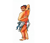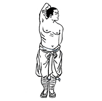 动作要领:左手臂上举,夹抱头部。右掌大拇指向上抵住后心。