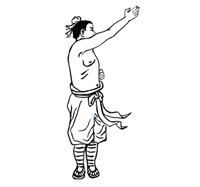 动作要领:右手握拳上提至肋下。左手成爪状,向右上方探出。