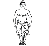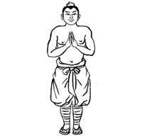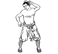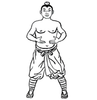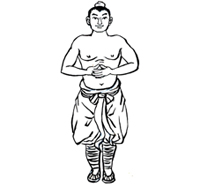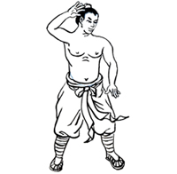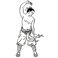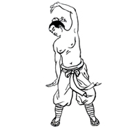 动作要领:左右膀伸各七次后,两手在体前合掌、调息。