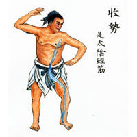 2.收势传承自南怀瑾先生,南师云:一套动作有预备势,必定有收势。南师传收势为,左右单举七次,两手在体前合掌,搓掌,待掌心发热后,击掌七次,依次拍打左右手的内关、外关各七次,再用两手同时依次拍打环跳、足三里、三阴交各七次。然后静坐养气。