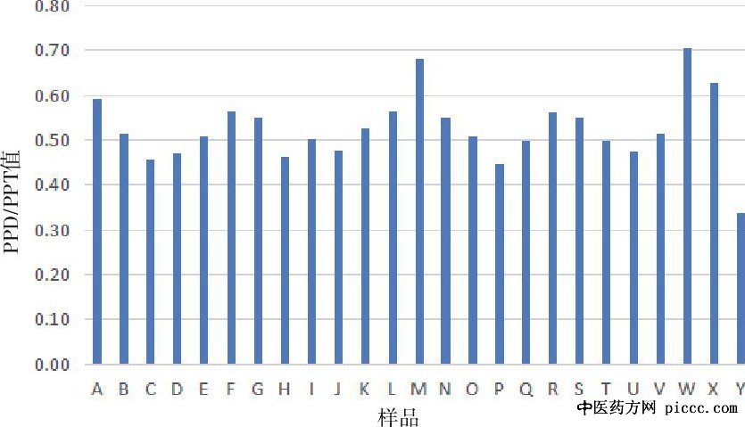 不同炮制品二醇型皂苷 (PPD=Rd+Rb1) 与三醇型皂苷 (PPT=R1+Rg1+Re) 与鲜品比较, 呈明显上升趋势。
