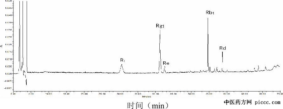 2.色谱条件717自动进样器;C18柱 (250mm×4.6mm, 5μm) 。流动相:水 (A) -乙腈 (B) 为流动相, 梯度洗脱 (A%为80%→80%→55%→55%→25%→25%→0%, 相应时间周期为0→30min→60min→60.01min→78min→78.1min→80min) 。检测波长203nm, 流速1.0m L/min, 进样量10μL, 理论塔板数按Rg1计算应不低于3 000, 各组分的分离度应符合要求。