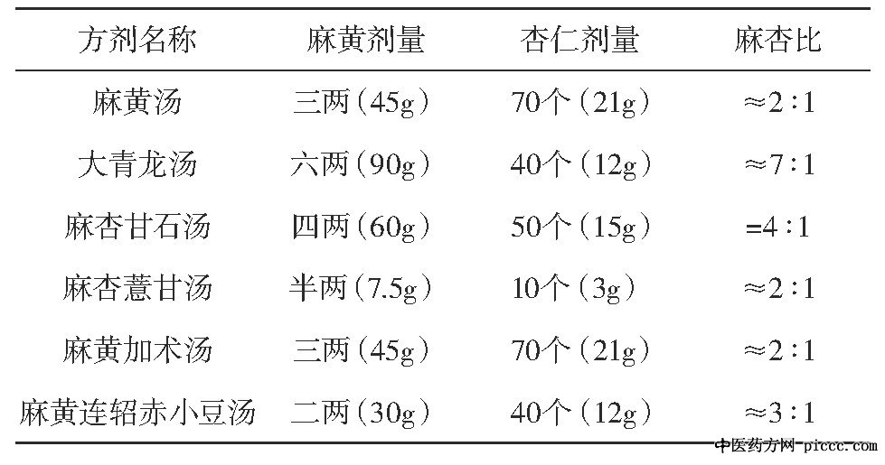 在《伤寒杂病论》中含有杏仁与麻黄配伍是最常见的组合方式, 根据《伤寒论》[2]教材附录中汉代度量衡折算后, 两药的配伍剂量如表1所示, 可以看出虽然都是治疗外感病, 但两药的配伍剂量差别很大, 大青龙汤中麻杏比约为7∶1;麻杏甘石汤中为4∶1;麻黄连轺赤小豆汤中两者比例约为3∶1, 其余均约为2∶1。多数注家及教材将麻杏配伍解释为宣肺平喘或降气平喘, 但是, 麻黄汤症并不一定兼喘, 麻黄汤却为何必用杏仁?在大青龙汤、麻杏甘石汤这种治疗邪热迫肺作喘的时候, 为何杏仁的用量反而减小了?现从以下几个方面展开论述。
