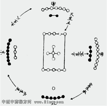 河图不仅描述了五行的生成,而且反映了五行间的相生关系。河图按顺时针方向旋转即为五行相生,即金生水、水生木、木生火、火生土、土生金。