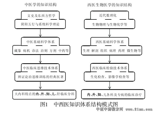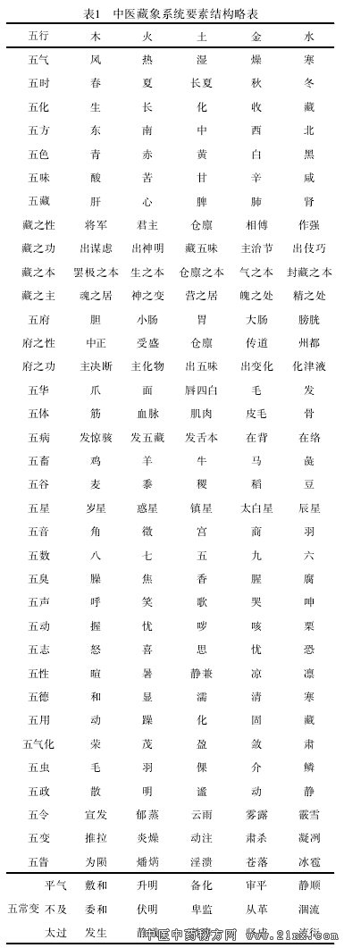 藏象为核心的中医体系 李 致 重(北京崔月犁传统医学研究中心) 摘要:中医基础科学体系包含藏象、诊法、病机、治则、方剂、药物六大范畴,是中医学之魂。藏象学说是基础的基础,代表着中医的本质特点。先哲运用了哲学的阴阳五行方法,观察了与生命相关的30多项要素,综合 了要素与要素之间错综复杂的相互关系,演绎为不同于西医基础科学体系的中医藏象学说。它的核心不是解剖及 其功能,而是与生命相关的要素及其联系。它完整、真实地体现了中医天人相应观、整体系统观、动态平衡观, 是人类科学发现、医学进步中无与伦比的独创领域,几千年来成功地指导着中医临床的防病治病。由于近代科学 主义和哲学贫困的影响,藏象学说在误读和误解中严重蜕变,西医脏器的影子愈见明显,藏象学说形同空壳,基 础科学体系分崩离析。实现中医复兴要以大科学观、大医学观为指导,重铸中华中医之魂。如此以来,中医的科 学、技术体系自然纲举目张,条分缕晰。 关键词:中医;哲学;藏象;多因素相关性;知识体系;中医复兴;要素结构略表;知识体系结构模式图 《黄帝内经》《难经》《神农本草经》所体现的 中医基础科学体系,主要包含六大范畴,即藏象、诊 法、病机、治则、方剂、药物。在这六大范畴中,藏象 学说代表了中医学的本质特点,是基础科学体系里 的基础。 用一般系统论的话来讲,藏象学说是中医意义 上的三道合一之人的整体生命系统模型,是由三道 合一之人相关的诸多要素为基础而建构的。四诊(诊 法)是中医临床诊察疾病的手段,以构成藏象的诸多 要素为参照,诊察疾病过程中三道合一之人的病理 表现。病机是以藏象学说为根据,在对诸多要素病 理表现观察的基础上,对疾病病因、病性及发展趋 势的概括。治则是以疾病病机的认识为根据,所制定 的促使三道合一之人恢复正常状态的战略决策。方 剂是以治则为根据,按君、臣、佐、使的功效标准组 合起来的,关于疾病治疗的战术布局。药物是根据方 剂的战术布局为根据,在疾病实施具体治疗的过程 中,对不同兵种、军种的恰当运用。 反之则可以这样理解:药物由方剂而使用,方剂 因治则而组成,治则因病机而确立,病机由四诊而认 识,四诊以藏象为根据。这同样表明藏象学说代表了 全部中医学的本质特点,它与西医学术体系中的生理 学、解剖学一样,是中医基础科学体系里的基础。 前文 [1] 就中医的研究对象、研究方法和基础医学 体系进行了讨论,本文则围绕构成中医藏象学说的要 素,进一步加以讨论、说明。 中医的藏象不同于西医的脏器 早在20世纪初恽铁樵先生曾说:中医学的藏象 是四时阴阳五行之藏象,绝非西医学的血肉之组织 与脏器 [2] 。所以认识中医学体系的本质特点,首先要 从藏象说起。 藏,音“zang”,其意与藏(音“cang”)相通,即藏 于内的意思。笔者曾经讲过,第一次文化高峰前后, 中外的先祖们都十分关注人体解剖结构的研究。只 是由于研究方法、工具的历史局限性,中外先祖们在 这一领域始终停留于同等粗浅的水平 [3] 。尽管如此, 这并没有影响中国的先祖对人类生命真谛的探索热 情。以《黄帝内经》为代表,先祖们明智地把探索生 命真谛的视野聚焦在其外所见的“象”上。所以“见 象而知藏”,就是对中医藏象学说既准确又传神的 生动概括。也可以说,先祖们不仅懂得内在的结构很 重要,而且外在的象也是人的生命真谛的反映,深入 地观察、研究所见的象,同样是知藏之所用的一条 途径。《黄帝内经》曰:“阴阳者,天地之道也”;“外 为阳,内为阴”;“阴者,藏精而起亟也,阳者,卫外而 为因也”;“阴在内,阳之守也,阳在外,阴之使也”; “阳化气,阴成形”等。这些观点既是“见象而知藏” 的哲学说明,也是藏象学说的理论依据。 笔者再次强调,我们决不能将西医的脏器与中 医的藏象相互混淆。如果说中医是形而上的以象论 藏,那么西医则完全是形而下的以脏说脏。在西医的 以脏说脏里,依靠的是人体解剖学技术,见到的是脏 器的形态结构,关注的是脏器的功能作用,它的视野 里完全没有无形无肉的中医学之象。所以为了避免因 中西医概念范畴的混淆而出现的中西医学理论体系 的混乱,笔者以为在中医的文献里最好使用“藏象” 二字,在西医的文献里最好使用“脏器”二字 [4] 。 西医进入中国一百多年以来,中医的教材以及诸 多文献里,“脏腑”普遍取代了原有的藏象意义上的 “藏府”。这决不是杞人忧天的画蛇添足,也不是文 字变迁上的吹毛求疵,其中既有学风低迷、不求甚解 的误读,也有人心浮躁、以西律中的误解。 例如:《黄帝内经·灵枢》里有一篇经文,名为 “经水第十二”。全篇以君臣问答的形式,写下了黄 帝与岐伯之间的四轮讨论。 第一轮讨论时,黄帝从十二经水“其有大小、深 浅、广狭、远近各不同”说起,联系到“五藏六府之高 下、大小、受谷之多少亦不等”,最后集中起来,向岐 伯提出了针灸治疗上“刺之深浅,灸之壮数”的问题。 岐伯没有直接就这一具体问题做回答,而是从整体角 度作了一个原则性的解释:“天至高,不可度,地至广, 不可量,此之谓也。且夫人生于天地之间,六合之内, 此天之高、地之广也,非人力所能度量而至也”。岐 伯在这里关于“天地之间,六合之内”,“非人力所能 度量”的解释,既是针对黄帝从“十二经
