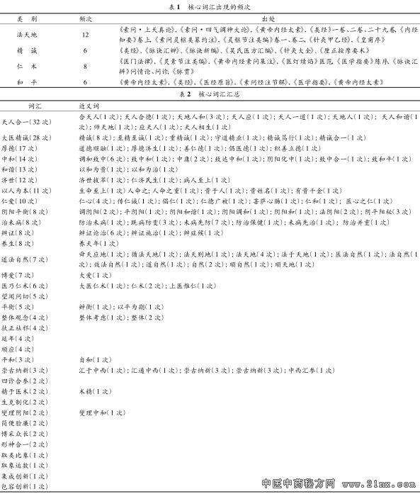 中医药文化是中华民族优秀传统文化的重要组 成部分, 其核心价值集中体现了中国传统科学文化 和优秀人文精神。对核心价值进行深入、 系统地研 究和解读, 彰显中医药文化特色, 充实中医药文化内 涵, 弘扬中医药文化精神, 既是本文的出发点也是落 脚点。 1 研究意义与目的 2009 年, 国务院下发《关于扶持和促进中医药 事业发展的若干意见》 , 将中医药文化建设纳入国 家文化规划。2012 年, 国家中医药管理局印发《中 医药文化建设 “十二五” 规划》 并提出 : “对中医药文 化内涵、 核心理念、 价值观念等进行深入挖掘、 整理 和研究, 深入探讨中医药核心价值体系的建设内容 和方法。 ” 2016 年 8 月, 国家中医药管理局编制的 《中医药发展“十三五” 规划》 又将弘扬中医药文化 作为重点任务, 强调要“挖掘、 整理、 研究中医药文 化内涵和原创思维, 研究总结中华民族对生命、 健康 和疾病的认识与理解, 提炼中医药文化核心价值和 精神实质, 构建具有中国特色和中医特点、 行业特征 并体现时代精神的中医药文化核心价值观” 。 由此, 中医药文化研究迎来了前所未有的机遇, 这是时代的召唤更是发展的趋势。推动中医药文化 特别是核心价值研究对促进中医学回归人文与自然 科学共生属性的完整理论体系, 提升中医自身的价 值, 激发其原创力、 生命力; 为现代科学研究拓展认 知方式、 思维方式; 倡导健康理念、 生活方式, 弘扬和 谐的生命观、 生态观、 发展观, 都具有重要的意 义 [1 ] 。但同时我们也应该看到, 当前研究还尚未完 善, 在理论形态的建成、 思想认识的建设、 宣传教育 的推广、 人才队伍的培养、 经费保障的提供等 [2 ] 方 面还存在很多不足。面对上述问题, 项目组以“中 医药文化核心价值观凝练” 为题, 力求从源头寻找 答案, 从精神、 行为、 物质等不同层面加以凝练, 对中 医药文化核心价值进行深入的探究和概括。 2 研究方法 采用 “三线三面” 网格式研究法 。“三线” 即 3 条贯穿研究始终的脉络, 包括对古籍文献的挖掘整 理、 对现代期刊的检索梳理、 对现有城市精神和行业 精神的搜集分析。通过对这三方面内容的汇总整 理、 研究分析, 挖掘阐释中医药文化内涵与核心价 值。 “三面” , 即 3 个覆盖研究始终的层面, 包括社 会各界热心人士、 不同领域及学科的专家学者、 中医 药行业管理部门。通过在网站、 报纸等媒体发出征 集通知, 面向社会大众广泛征集; 向行业内外专家学 者重点征询并组织座谈研讨; 向中医药行业管理部 门征询意见和建议等, 确保凝练出的核心价值获得 广泛认可, 经得起时间考验。 3 研究内容与结果 表 1 显示, 在文献梳理方面主要分为两个步骤, 一是古籍文献搜索, 二是现代期刊文献搜索。在古 籍文献搜索过程中, 发现法天地、 精诚、 仁术、 和平作 为核心词汇出现的频次较多。 表 2 显示, 在现代期刊搜索过程中, 对 CBM 数 据库、 中国中医药期刊文献数据库、 中国知网数据 库、 万方数据库进行了搜索, 以中文标题“文化” 、 “中医 ” 、 “中药” 、 “传统医学” 为核心词, 共检索出 文献 3768 篇, 剔除重复性文献后剩余 2344 篇文献。 为检索文章全面, 对 2344 篇文献进行人工筛除后剩 余了 710 篇。通过对文献的系统归纳和整理, 共梳 理了 32 个词汇。 ![]() 表 3 归纳分类 类 别 频次 词条举例 道 德 观 68 大医精诚、 仁心仁术、 积善厚德 治 疗 观 56 治未病、 以人为本、 济世贵生、 扶正 健 康 观 43 中和、 阴阳和谐、 以平为期 生 命 观 41 天人合一、 医法自然、 法天则地 思维方式 23 整体观念、 取象比类、 崇古纳新 在实地调研方面, 项目组汇集了北京、 上海、 天 津、 重庆、 广州等 91 个省、 自治区、 地级或县市级的 城市精神, 以及包括烟草、 航天、 水利、 银行、 保险、 政 法干警等 11 个行业精神。经研究发现, 这些行业精 神多以通俗易懂、 朗朗上口的对偶或排比句式体现, 有的是文言语体, 有的是现代汉语。基于此, 中医药 文化核心价值观的凝练及阐释也应主动参考和借 鉴, 通过缜密思考、 集思广益, 真正能提炼、 形成经得 起时间考验且群众认可的行业精神。 在专家及社会人员征询方面, 以邮件、 电话、 信 函、 会议、 网络征集等形式开展了 3 次大范围的征询 工作, 人员涵盖国家中医药管理局、 国家中医药管理局直属单位、 地方中医药管理局、 地方中医药科研院 所、 地方中医药高校、 老字号企业等不同层面的 200 余名专家及社会热心人士。在第一次征询中, 共收 到 25 条专家建议稿, 270 条社会投稿, 项目组对征 集到的词汇进行了同类归并及频次分析, 发现样本 量虽然大, 却存在一定共识。如天人合一类词汇出 现 32 次, 大医精诚类词汇出现 28 次, 厚德类词汇出 现 17 次, 中和类词汇出现 14 次等。经进一步聚类 分析, 归为以下几类( 见表 3) 。在第 2 次征询中, 共 收到意见建议 61 条, 在综合专家意见和前期文献分 析及实地调研结果的基础上, 从中医药的生命观、 健 康观、 治疗观、 道德观和思维方式 5 个维度对中医药 文化核心价值进行了进一步概括, 表述为“医道自 然、 治病求本、 精诚仁和、 历久弥新” 。第 3 次征询 通过挂号信、 传真、 电子邮件等形式, 就初步形成的 5 个表述内容面向国家中医药管理局