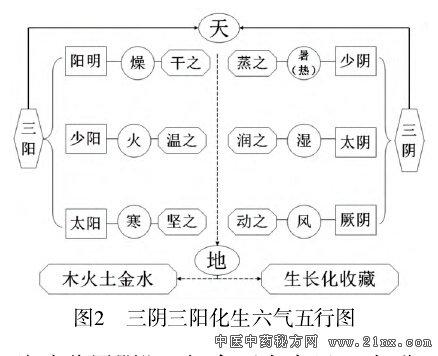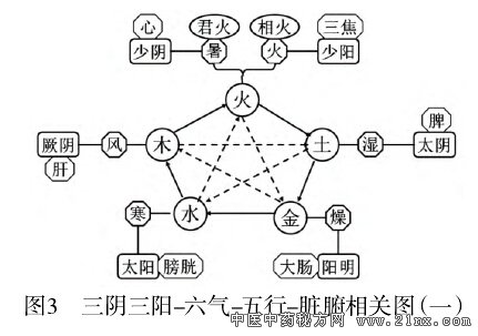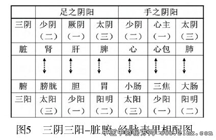 人身之中脏腑经脉均有特定的三阴三阳名称。 如《灵枢·经脉》中提及“肺手太阴之脉”“大肠手阳 明之脉”“胃足阳明之脉”“脾足太阴之脉”等有关 手足十二经脉及相关脏腑之名,均直接以三阴三阳 之名,即太阴、少阴、厥阴、太阳、阳明、少阳冠之。 但是,在《黄帝内经》(以下简称《内经》)中,并无任 何篇章直接论及是依据什么方法将不同的脏腑经脉 与三阴三阳联系起来,后世医家亦未能就此有清晰 的补充。 问题的提出 1. 三阴三阳,气有多少 三阴三阳之名是依据 《素问·至真要大论》所云“气有多少异用”之原理 而来的。按阴阳气由少而多排列,分别为厥阴(一 阴)、少阴(二阴)与太阴(三阴),及少阳(一阳)、 阳明(二阳)与太阳(三阳)。故《素问·天元纪大论》 云:“阴阳之气,各有多少,故曰三阴三阳”。若以此 为标准来认识脏腑经脉之三阴三阳,则具有特定名 称之脏腑及经脉应该能反映出其阴阳气有多少不 同。譬如,肺手太阴之脉,应该是肺及其经脉之阴气 最多,其余依此类推。但实际上,在认识脏腑经脉之 阴阳气时,并不能如此简单地将其与所相关的三阴 三阳对等起来。 《素问·血气形志篇》又指出:“夫人之常数,太 阳常多血少气,少阳常少血多气,阳明常多气多血; 少阴常少血多气,厥阴常多血少气,太阴常多气少 血。此天之常数也”。若以此而言,则人身之三阴三 阳又不以阴阳气之多少分,而是以气血多少分。若将 气血分阴阳,气为阳而血为阴。再将“气为阳”与“血 为阴”作一关联,则会出现另一种状态。即:太阳常 多血少气,则太阳常多阴少阳;少阳常少血多气,则 少阳常少阴多阳……如此一来,与上述三阴三阳所反 映之阴阳气多少更加不一致。 清朝医家周学海在其《读医随笔》中曾就《三 阴三阳名义》作专门论述,提出“三阴三阳者,天之 六气也,而人身之血气应焉。然血气之行于身也,周 流而无定,而三阴三阳之在身也,有一定之部份…… 人身三阴三阳之名,因部位之分列而定名,非有血气 之殊性以取义也” [1] 。特别强调“经络之三阴三阳, 以其所行部位分表里言之也;脏腑之阴阳,以其脏 腑之本气刚柔清浊言之也” [1] 。迄今为止,有关三阴 三阳之命名基本上都是从经脉所行之部位为认识的 切入点。 2. 经脉名称与循行位置 《中医基础理论》 教材在介绍十二经脉时会根据十二经脉在四肢的 循行部位,指出“分布于四肢内侧面的经脉,属阴 经;分布于四肢外侧面的经脉,属阳经” [2] 。内侧分 三阴,外侧分三阳,则太阴、阳明在前缘;少阴、太 阳在后缘;厥阴、少阳在中央。当经脉之三阴三阳 确定之后,与经脉相关的脏腑就自然而然地随之而 有同名。但教材却没有说明为什么经脉会有如此的 循行分布。若果真依经脉所在位置而分三阳三阴, 则三阳之序为阳明(二阳)、少阳(一阳)与太阳(三 阳),而三阴之序则为太阴(三阴)、厥阴(一阴)与 少阴(二阴)。如此,则显而易见与三阳三阴所代表 之“阴阳之气,各有多少”之序并不相符。 现代的一些研究曾试图从阴阳气之多少来解释 手足三阴三阳经脉的这种分布特点,如赵喜新等 [3] 提出首先根据五脏六腑所处部位确定其阴阳气之多 少,然后将之与相关的经脉相联系而确定经脉三阴 三阳之名;叶庆莲 [4] 则认为先定下人身结构之三阴三 阳名称,再结合阴阳气之多少,根据经脉所在部位及阴 阳气多少而命名经脉三阴三阳;朱小俊 [5] 则认为经脉 在四肢前、中、后的分布是遵照阴阳平衡之规律而形成 的。但无论那一种认识,都有一个共同之处,就是在 阴阳气多少与三阳命名上,都认为“阳明”之阳气最 盛,为三阳;“太阳”次之,为二阳;“少阳”则最少, 而为一阳。这与《内经》中有关太阳为三阳、阳明为 二阳之认识是完全不同的。例如《素问·阴阳类论》 中直接有“所谓三阳者,太阳为经”、“ 所谓二阳者, 阳明也”以及“一阳者,少阳也”之提法。所以,建立 在以阳明为三阳、太阳为二阳基础上的分析,其前提 必须是先修正太阳与阳明之属性,这与《内经》是不 相符合的。 脏腑经脉之三阴三阳命名到底是随意而无特定 意义?抑或刻意而有其特殊意义?始终是中医学在 理论层面需要解决的一个大问题。如果不能在理论 上说明脏腑经脉之三阴三阳命名的原理,就会导致 如周学海所说的“十二经之三阴三阳之为借名矣” [1] 的结论,即十二经脉不过是借三阴三阳之名而实际 上与三阴三阳无关。从这一结论再推下去,则脏腑经 脉亦不过是借阴阳之名而已。如果处于人身功能系 统中心的脏腑经脉都只是借阴阳之名,那么,整个中 医学中阴阳这一最核心的概念恐怕就没有意义了。所 以说,这是中医学在理论层面需要解决的一个大问 题。而对于这么大的一个学术问题,竟然甚少有专门 的研究报告,不能不说是很大的遗憾。 天地阴阳与脏腑之相应关系 《灵枢·海论》指出:“夫十二经脉者,内属于腑 脏,外络于肢节”。在《灵枢·经脉》中论及手足十二 经脉之循行时,最后必定要将其“属”于某一特定 的脏腑,譬如“肺手太阴之脉,起于中焦,下络大肠, 还循胃口,上膈属肺”。由于脏腑是经脉之根本,因 此,要思考脏腑经脉是如何与三阴三阳发生特定关 系这一问题,就必须先回到天地阴阳与脏腑的关系 上来。 1. 五脏应四时、五行 《素问·宝命全形论》 谓:“人生于地,悬命于天”,指出了应该将生
