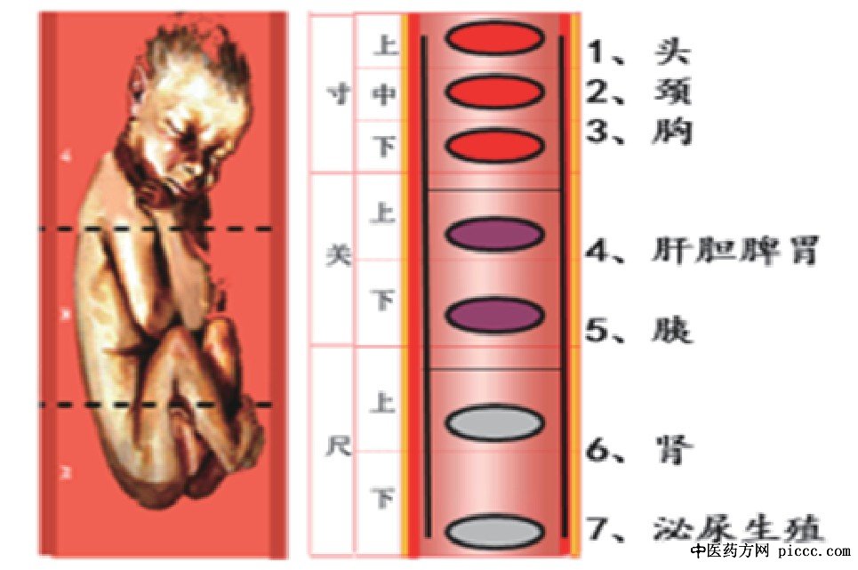 候头、颈、胸。具体:上候头, 中候颈, 下候胸。左寸脉下1/3浮候心, 中位候左肺。右寸脉下1/3候右肺。
