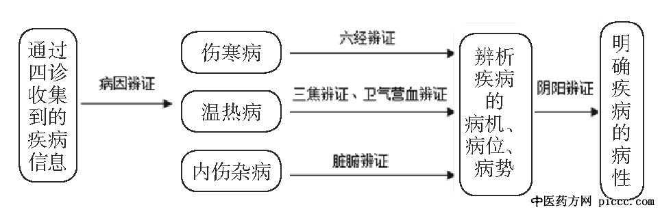 除了上述提到的六经、八纲、病因、卫气营血、三焦、脏腑、气血津液、经络等辨证方法, 还有体质辨证等。各辨证方法之间相互配合为用, 概括来说医者临证时以八纲辨证思想为总纲领, 以气血津液辨证和脏腑辨证为基础, 结合六经、卫气营血和三焦等辨证方法, 进行综合、分析、归纳, 以寻找病证的根源和病变的本质, 做出‘证’的判断, 进而在中医“理、法、方、药”理论的指导下, 确定适当的治疗方法和配伍用药[11]。
