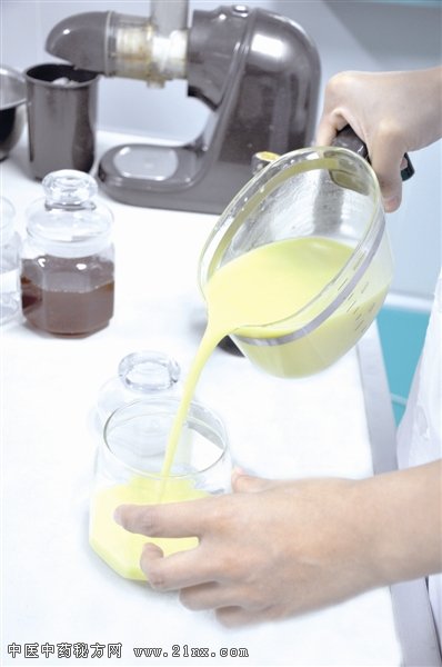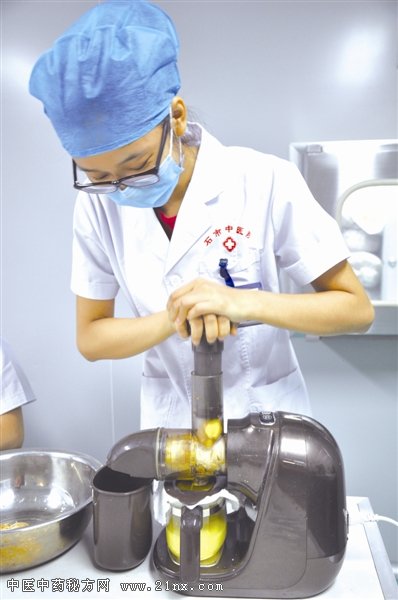 根据药方,要往药粉中加入一定比例的姜汁进行调和。由于治疗病种的不同,有的药贴还需要用黄酒或醋作辅料。工作人员正将仔细泡洗过的生姜榨汁,榨出的姜汁颜色金黄鲜亮,辛辣的姜味扑鼻而来。