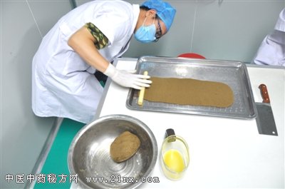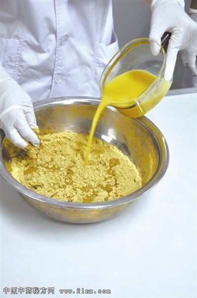 首先根据处方将药材粉碎、过筛。由于“三伏贴”是直接贴在皮肤上,所以要求粉碎的药材必须细腻,要达到100目的粉碎标准;也就是说,每个粉碎后的中药颗粒直径不能超过0.15毫米。粉碎后还要“过筛”,只有被“筛过”的药粉才可入药,因为过筛后的药粉均匀度提高,更有利于药效的发挥。 ![]()