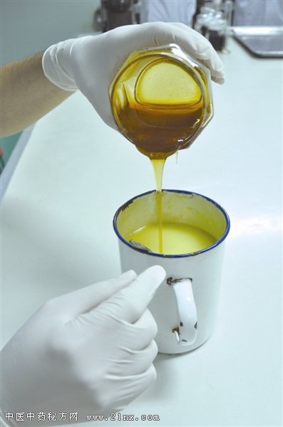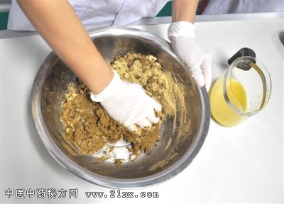随后再将蜂蜜按照比例缓缓倾入姜汁中,将两者进行混合。 最后将姜汁蜂蜜混合物倒入药粉中。像和面一样将药粉和成药团,这就是和坨。 第五步压制药饼 ![]()