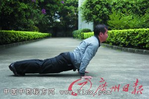 全身蹬直,足趾与手指贴地,一俯一仰连续行八十一次呼吸。该动作为全身运动,主要锻炼腰颈腿。身体下探时呼气,回复时吸气,九个呼吸为一组运动。