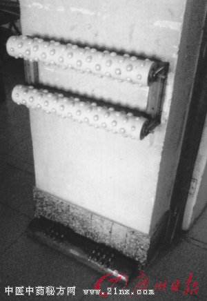 5 撞背器 为提高撞背的效果,做了一块穴位撞背器(图⑥)。取一块背部大小的五夹板,按背部穴位贴上一厘米大的木珠,按背部高度固定在阳台墙上,配一个铝片盖即成。撞背时取下铝片盖,背部正对穴位撞背器,离墙约20厘米站立,初次撞背要轻,以免损伤。头向前倾撞腰部,每回各撞100次,刺激腰背穴位,有轻微酸痛感,消除腰背疲劳与酸痛,常撞背防病养生,撞腰背部相关穴位,有治病效果,我经常感冒不再犯了。