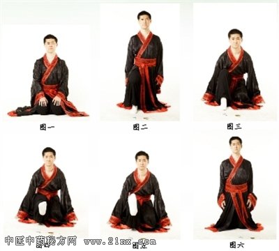 1.正身跪坐,两手自然放于两腿上,头正颈直,竖脊含胸,呼吸均匀,思想安静,全身放松(图一)。