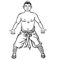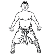 两脚开立,略宽于肩,屈膝下蹲成大马步.